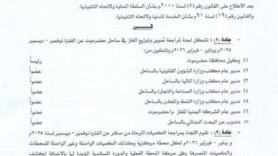 أصدر عضو مجلس القيادة الرئاسي محافظ حضرموت الاستاذ سالم احمد الخنبشي، اليوم، القرار رقم (43) لسنة 2026م بشأن تشكيل لجنة المراجعة تموين وتوزيع الغاز بساحل حضرموت