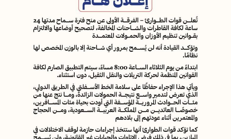 تُعلن قوات الطوارئ – الفرقة الأولى عن منح فترة سماح مدتها 24 ساعة لكافة القاطرات والشاحنات المخالفة، لتصحيح أوضاعها والالتزام بقوانين تنظيم الأوزان والحمولات المعتمدة.وتؤكد القيادة أنه لن يُسمح بمرور أي شاحنة إلا بالوزن المخصص لها نظامًا.📍 ابتداءً من يوم الثلاثاء الساعة 8:00 مساءً، سيتم التطبيق الصارم لكافة القوانين المنظمة لحركة التريلات والنقل الثقيل، دون استثناء.⚠️ ويأتي هذا الإجراء حفاظًا على سلامة الخط الأسفلتي في الطريق الدولي، الذي تعرض لتدمير واسع نتيجة الحمولات الزائدة، وما نتج عنها من مئات الحوادث المرورية المؤسفة التي أودت بحياة مئات المسافرين، خصوصًا العائدين من المملكة العربية السعودية، ومن الحجاج والمعتمرين أثناء عودتهم إلى بلادهم🚫 كما تؤكد قوات الطوارئ أنها ستتخذ إجراءات حازمة لوقف الاختلالات في الميازين، بما في ذلك فرض الإتاوات والجبايات غير القانونية، ولن يُسمح بأي تلاعب أو استغلال تحت أي ظرفصادر عن: قوات الطوارئ – الفرقة الأولى