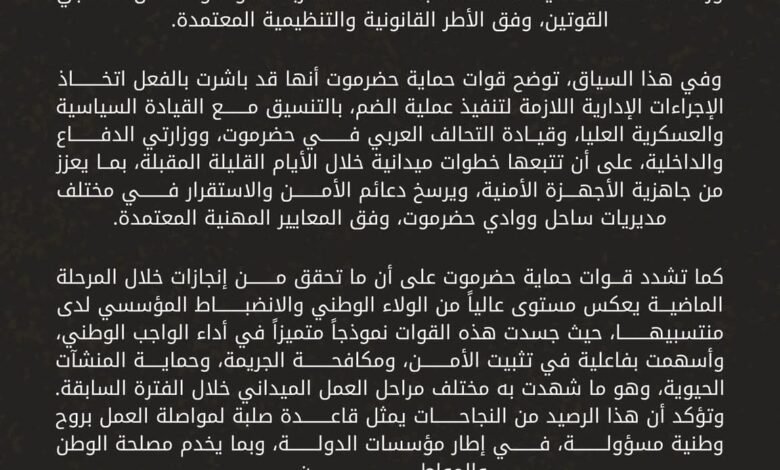 كما تشدد قوات حماية حضرموت على أن ما تحقق من إنجازات خلال المرحلة الماضية يعكس مستوى عالياً من الولاء الوطني والانضباط المؤسسي لدى منتسبيها، حيث جسدت هذه القوات نموذجاً متميزاً في أداء الواجب الوطني، وأسهمت بفاعلية في تثبيت الأمن، ومكافحة الجريمة، وحماية المنشآت الحيوية، وهو ما شهدت به مختلف مراحل العمل الميداني خلال الفترة السابقة. وتؤكد أن هذا الرصيد من النجاحات يمثل قاعدة صلبة لمواصلة العمل بروح وطنية مسؤولة، في إطار مؤسسات الدولة، وبما يخدم مصلحة الوطن والمواطن.