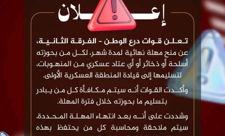 تعلن قوات درع الوطن – الفرقة الثانية عن منح مهلة نهائية لمدة شهر، لكل من بحوزته أسلحة أو ذخائر أو أي عتاد عسكري من المنهوبات، لتسليمها إلى قيادة المنطقة العسكرية الأولى