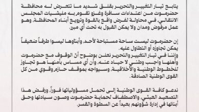 تيار التغيير والتحرير يصدر بياناً حازماً، مؤكداً أن أمن وسيادة #حضرموت خط أحمر ولن يسمح بأي اعتداء على أرضها وكرامة أبنائها