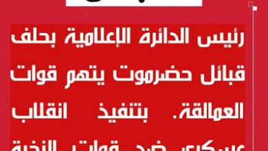 عاجل| رئيس الدائرة الإعلامية بحلف قبائل حضرموت يتهم قوات العمالقة بتنفيذ انقلاب عسكري ضد قوات النخبة الحضرمية والسيطرة على مطار…
