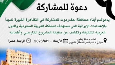 | 30 مارس 2026 | المكتب الإعلامي. باركت السلطة المحلية بمحافظة حضرموت دعوات القوى والمكونات الحضرمية للاحتشاد والمشاركة في وقفة…
